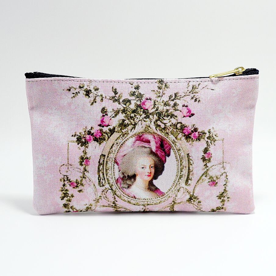 この平型ポーチは、まるでマリーアントワネットの宮廷にタイムスリップしたかのような優雅さを漂わせています。